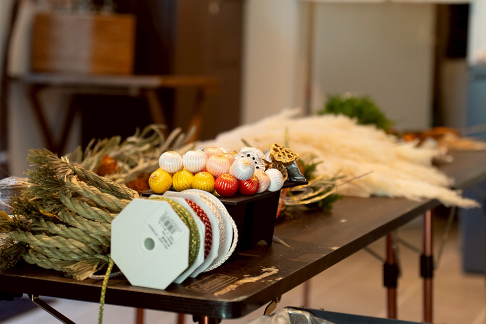 道具はすべてUme Sonare OARAIで用意し、講師が一からレクチャー。初めての方でも、手ぶらで気軽にご参加いただける内容です。思い思いの感性で仕立てていく時間は、冬ならではの穏やかな手仕事のひとときとなりました。