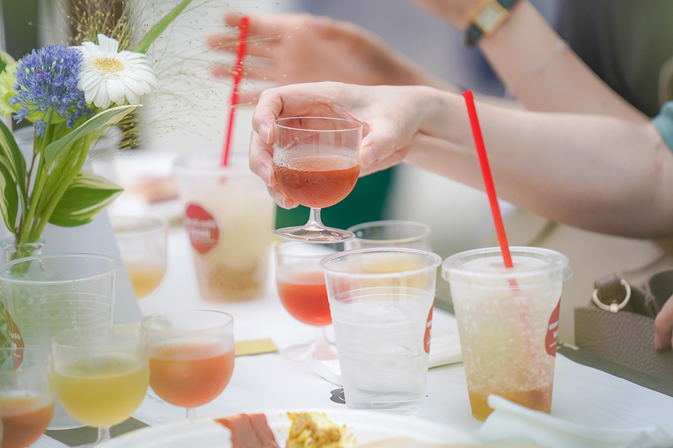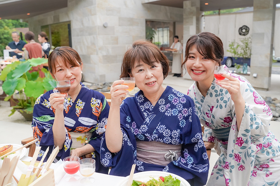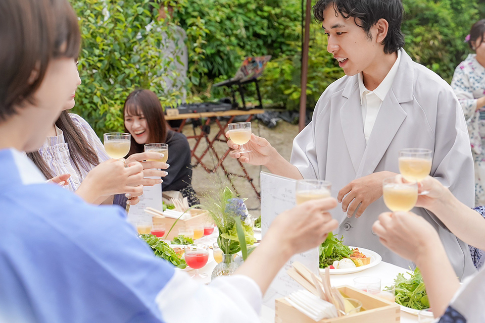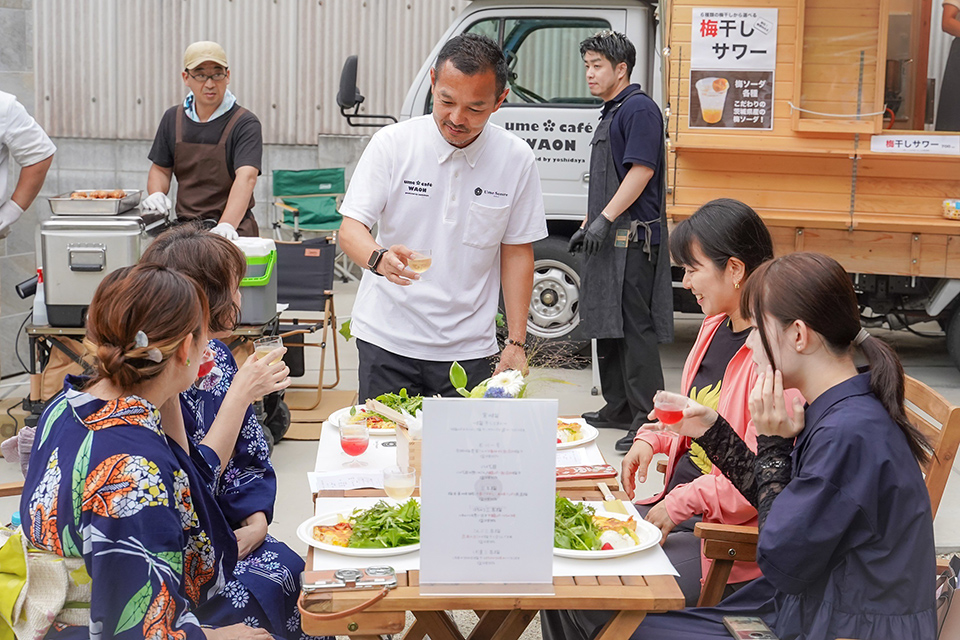 1周年を祝う会は、夏の夕暮れ時のUme Sonare OARAIで開催されました。 吉田屋八代目と「月の井酒造店」八代目が共演し、厳選した8種類の梅酒飲み比べや、選べる梅干しサワーをご提案。地元の「谷口農縁」の新鮮な野菜や「メツゲライ タモン」のソーセージなど、茨城の美食をふんだんに使った梅料理を、心地よい生演奏と共にパークの開放的な空間で堪能していただきました。